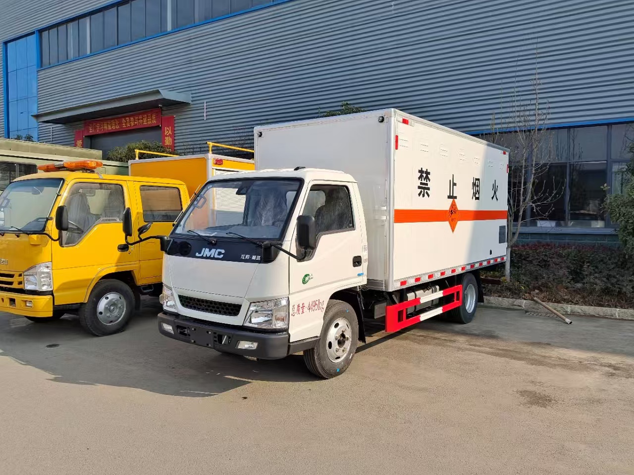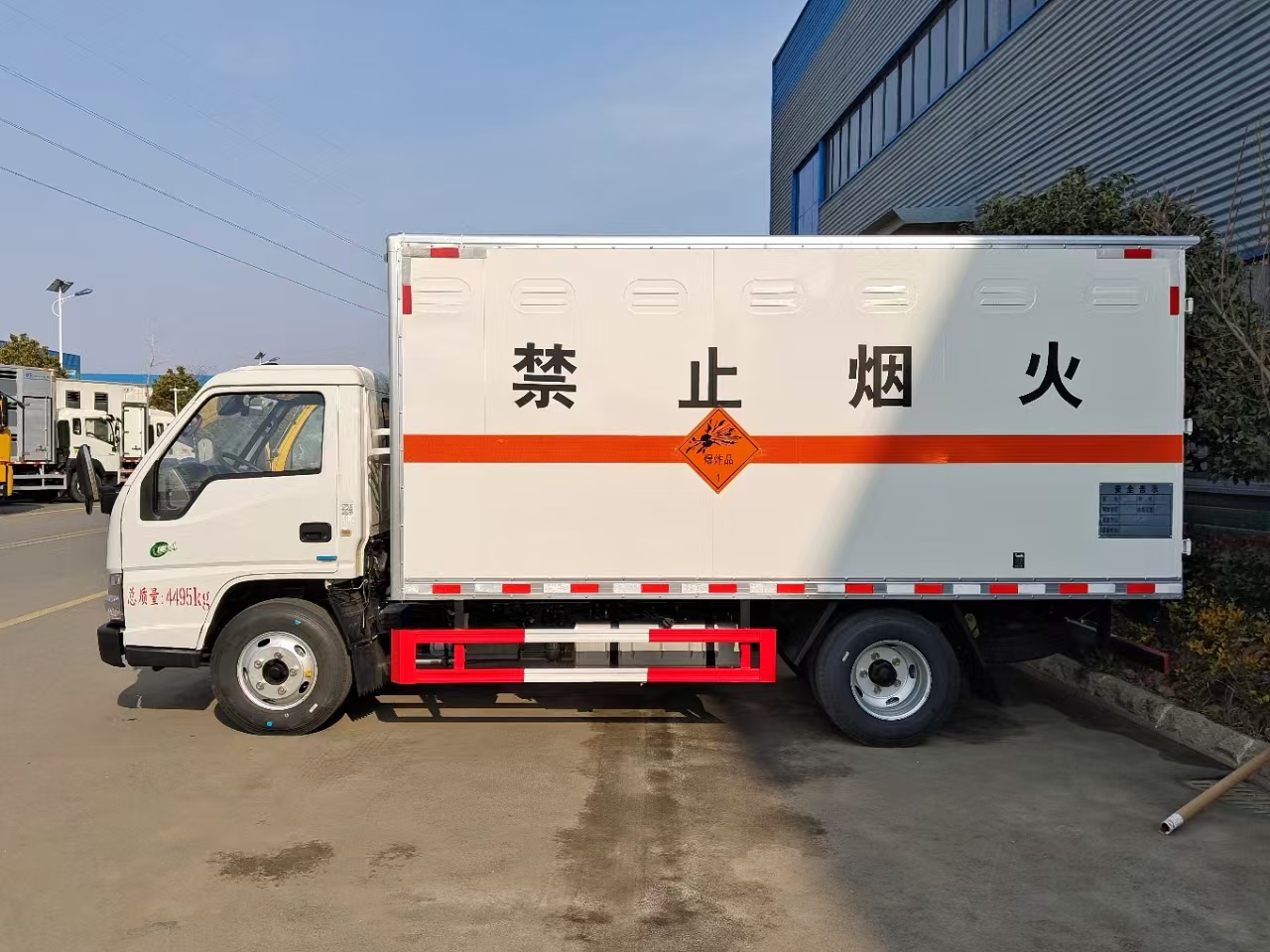 | 貨箱配置 | 廂體為雙層金屬骨架結(jié)構(gòu),外板采用冷軋鋼板,中間填充阻燃泡沫,內(nèi)飾為鋁板。底板為平板上鋪防靜電膠皮。廂內(nèi)兩側(cè)加裝固定貨物臥環(huán),門框帶防盜報警器,頂部帶煙霧報警器,廂體右側(cè)選裝側(cè)門,隨車配2個滅火器,危險標(biāo)志牌,防火帽,危險品三角頂燈。 | ||