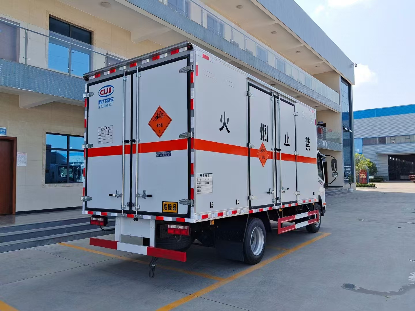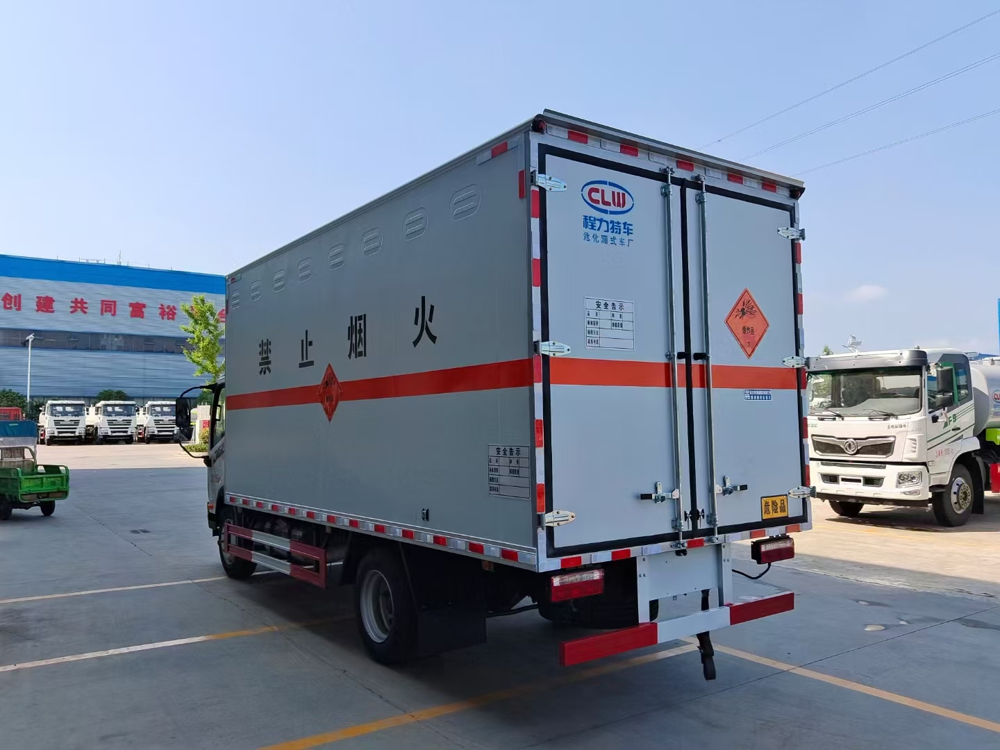 | 貨箱配置 | 廂體為雙層金屬骨架結(jié)構(gòu),外板采用冷軋鋼板,中間填充阻燃泡沫,內(nèi)飾為鋁板。底板為平板上鋪防靜電膠皮。廂內(nèi)兩側(cè)加裝固定貨物臥環(huán),門框帶防盜報警器,頂部帶煙霧報警器,廂體右側(cè)選裝側(cè)門,隨車配2個滅火器,危險標志牌,防火帽,危險品三角頂燈。 (尾部可選裝液壓升降尾板) | ||